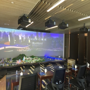 該項目相對較小,深圳龍程威尼根據用戶需求,以及營銷中心的行業性質,以聲光電數字沙盤展現為主,側方位墻體上以投影機進行輔助展示說明。
